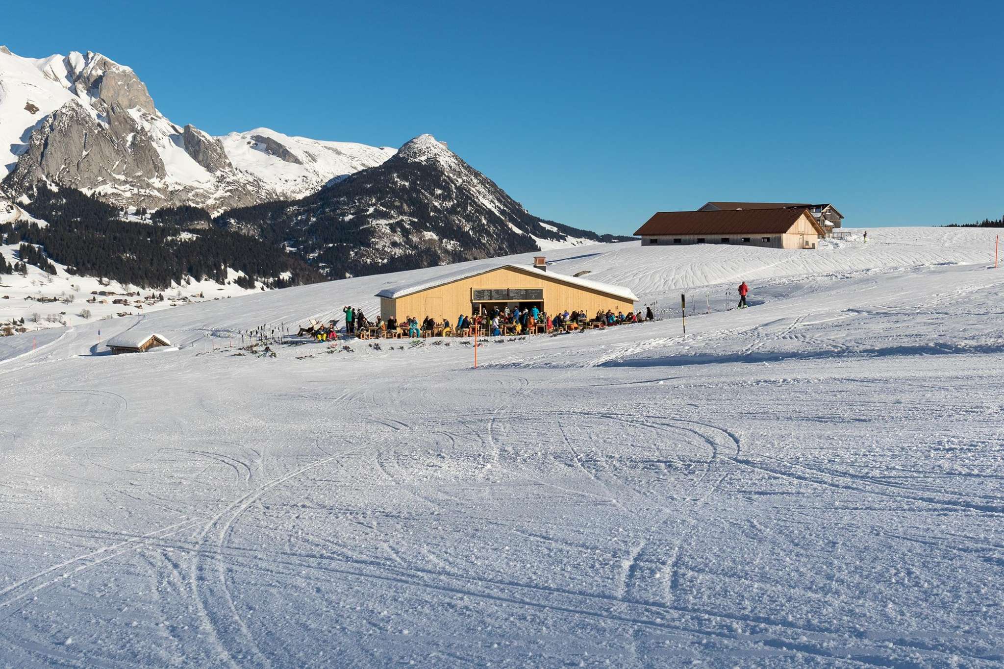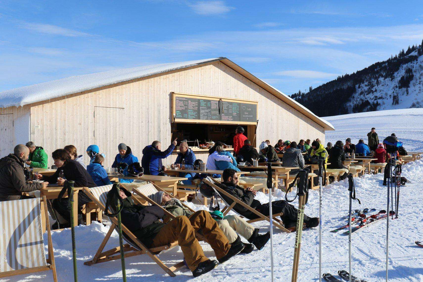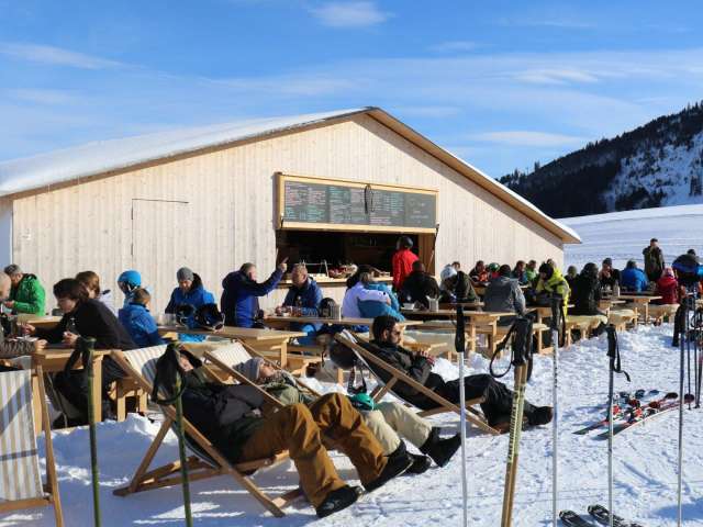 Geniessen Sie Flammkuchen, heisse Suppen und Schlorzifladen auf der Sonnenterrasse direkt am Pistenrand