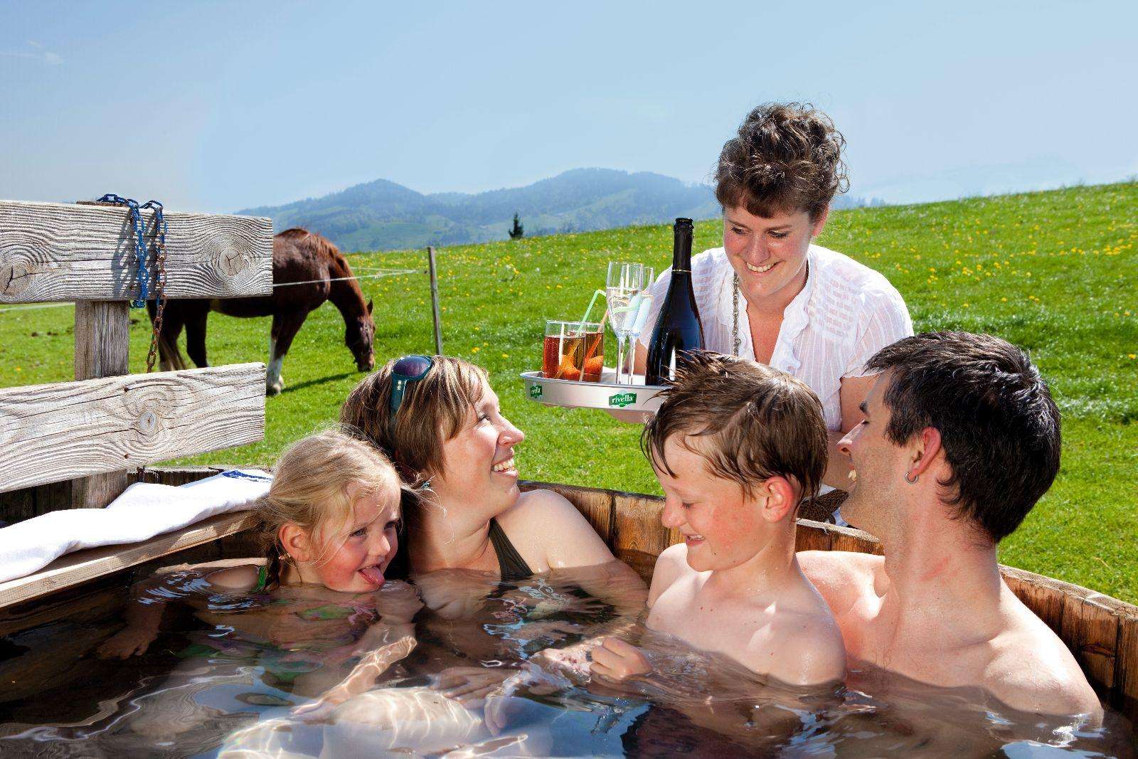 Mit dem Holzzuber lässt der Weid-Hof eine alte Tradition des Badens an der frischen Luft wiederaufleben und bietet verschiedene Aroma- und Molkebäder an. Auf 900 m ü. M., inmitten von grünen Wiesen und Wäldern mit grandioser Aussicht übers Toggenburg. Auf dem Holzfeuer wird der Inhalt des Zubers auf 38 Grad erwärmt. in der kalten Jahreszeit wird dennoch eine Mütze empfohlen.