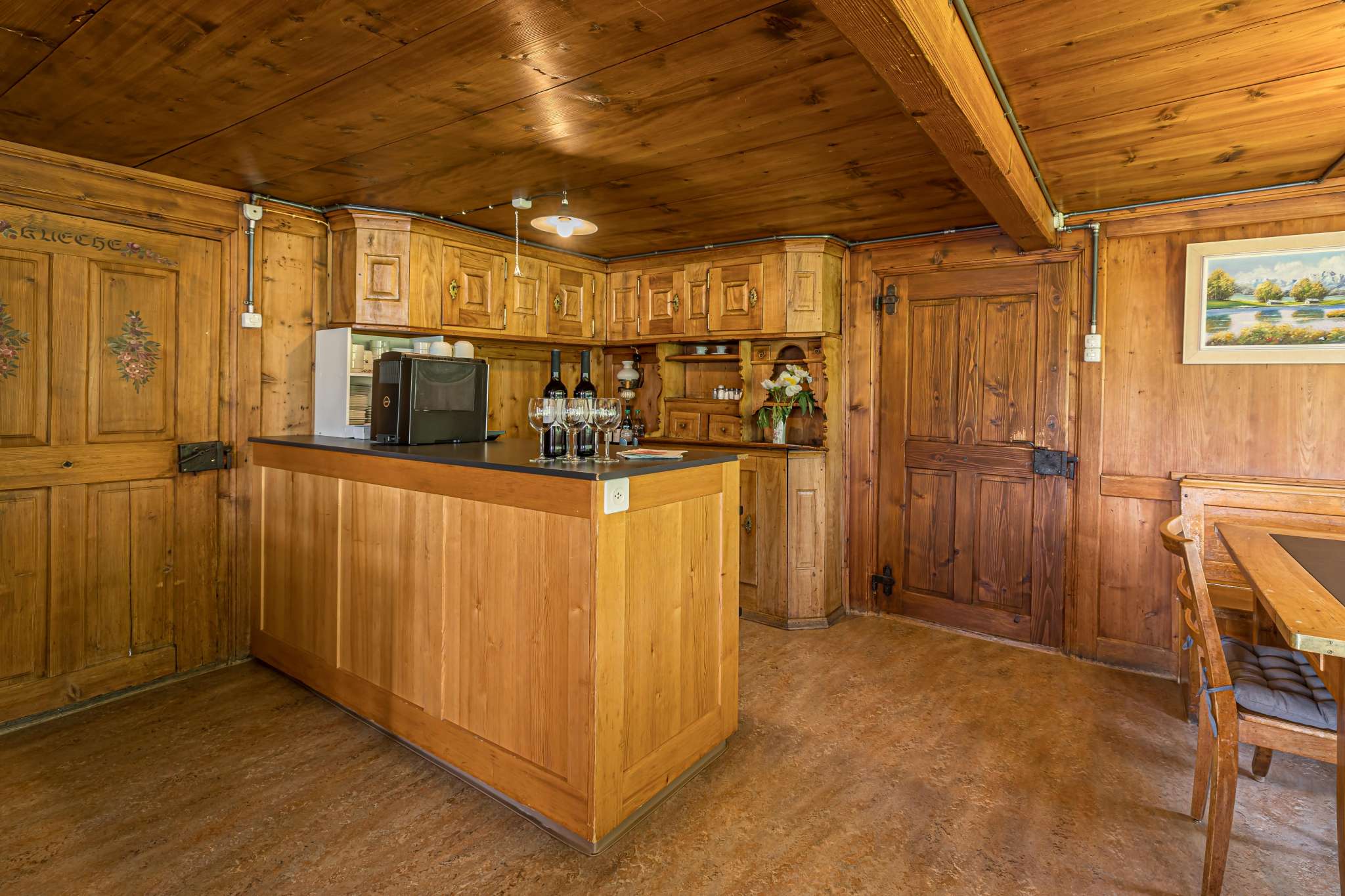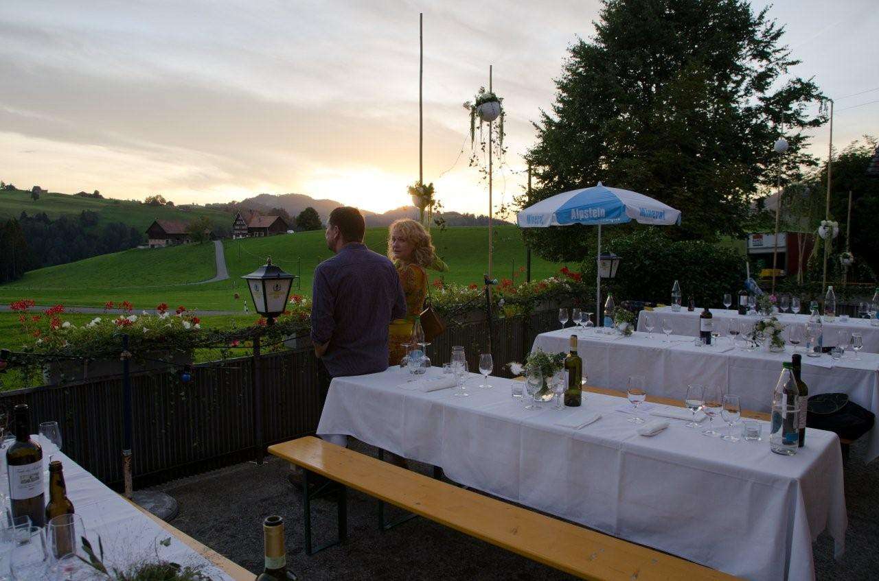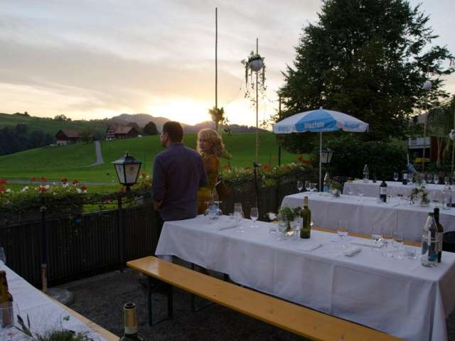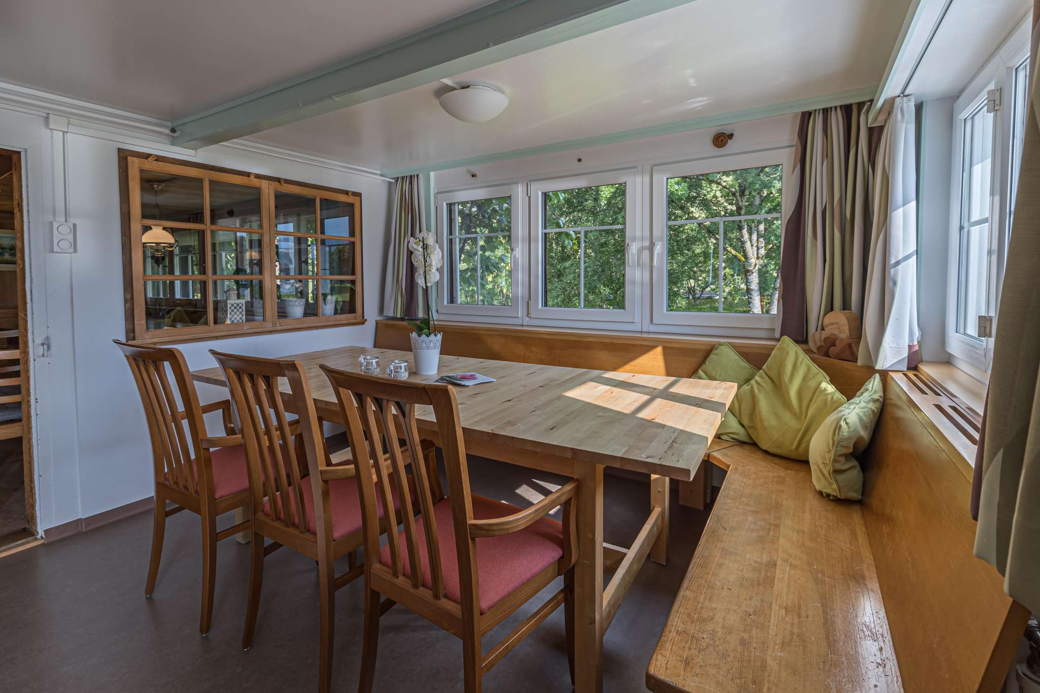 Das angrenzende Sääli mit drei Fensterfronten bietet Licht, Freundlichkeit und eine schöne Aussicht auf das Neckertal und den Hemberg. Dieser Raum hat direkten Zugang zur Terrasse, eine Durchreiche zur Küche, bietet Platz bis zu 25 Personen und wird oftmals als Ess- oder Seminarraum benutzt.