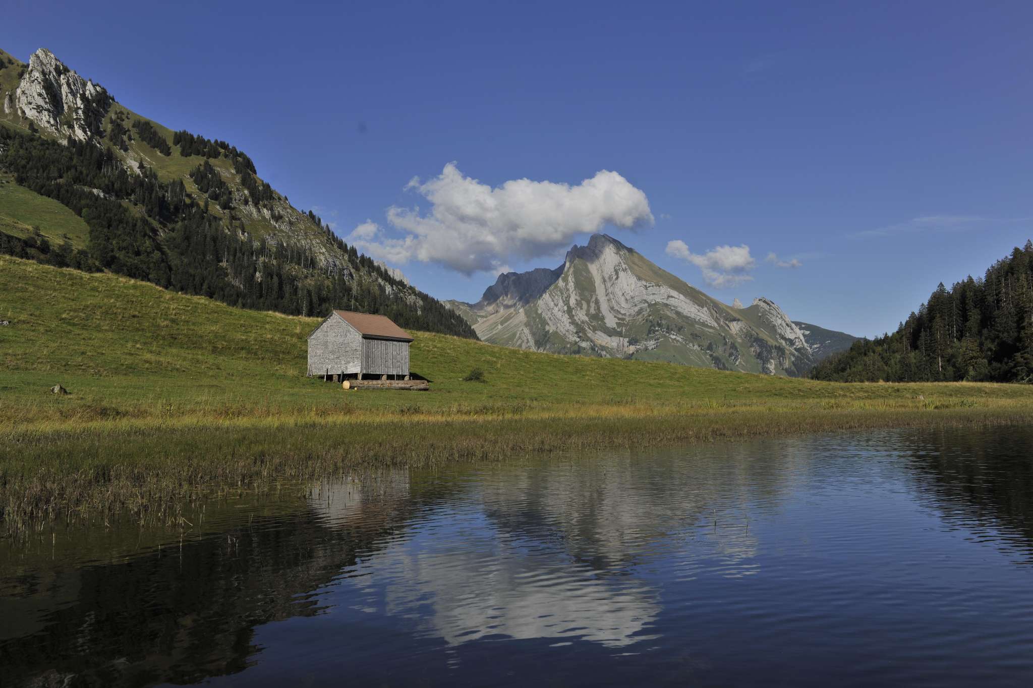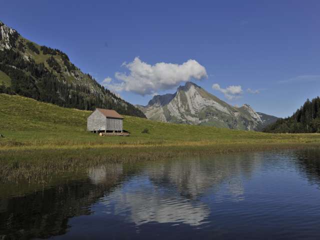 Der malerische Gräppelensee liegt in einer breiten Mulde südlich des Lütispitz auf 1307 m über Meer.