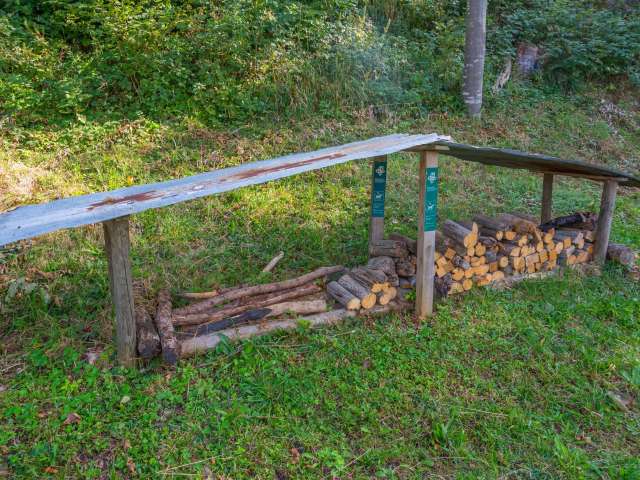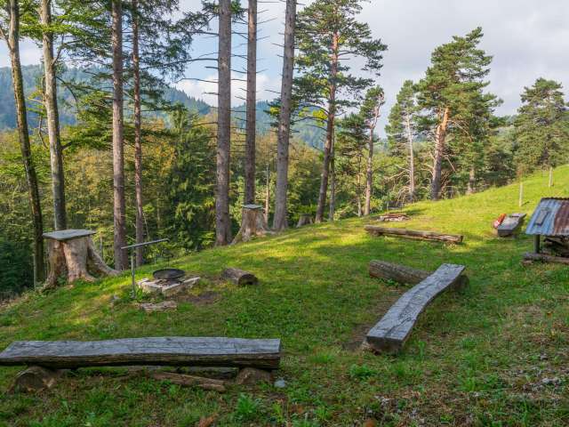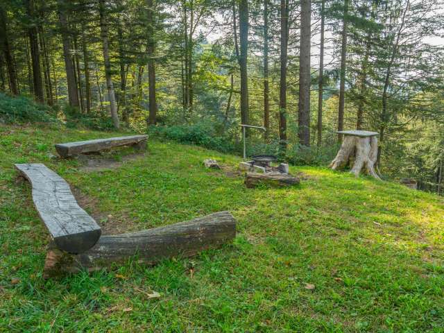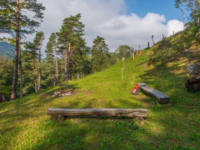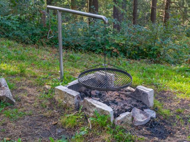 Grillplatz in lichtem Wald für bis zu 20 Personen mit Holz und Sitzgelegenheiten.