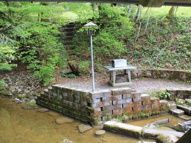 Währenddem das Essen auf dem Rost grilliert wird, können das kleine Wasserrad bestaunt und die dritte Station vom Kneippweg mit Wassertreten ausprobiert werden. Sitzmöglichkeiten stehen mit der Mauer gewisse zur Verfügung.