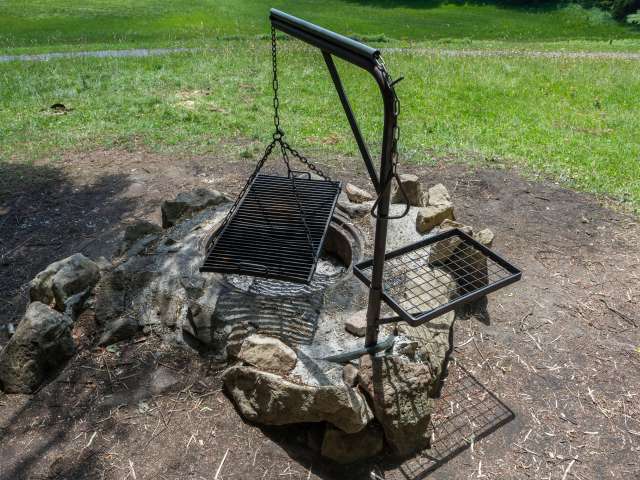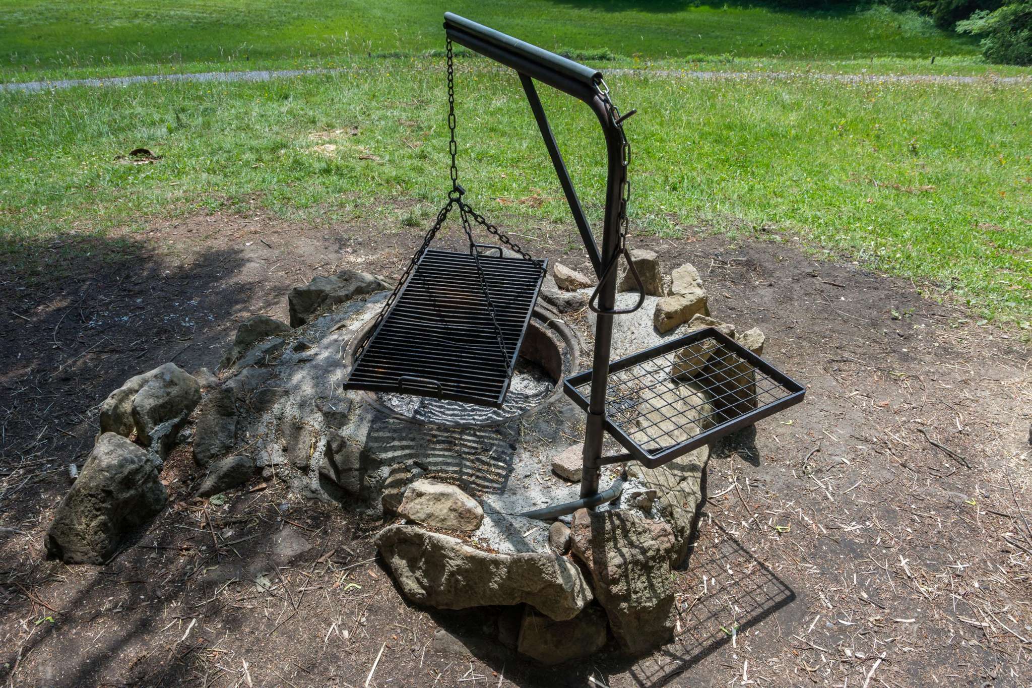 Der Grillplatz Salomonstempel liegt rund 200 Meter vom gleichnamigen Ferienhaus entfernt. Direkt am Waldrand gelegen, findet man hier einerseits viel Schatten, andererseits aber auch Ruhe. Die Feuerstelle ist rund gemauert und sie verfügt über einen hängenden Rost, der gut in der Höhe verstellt werden kann. Um die Feuerstelle herum liegen drei grosse Steinquader, die als Sitzgelegenheit dienen. Etwas Holz steht zur Verfügung, allerdings ist der kleine Holzunterstand zugeschraubt. Einzig unter dem vorstehenden Dach findet man etwas Holz.