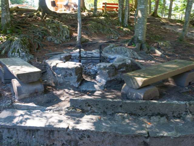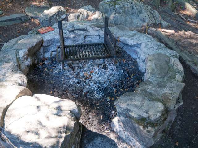 Die Feuerstelle ist rund gemauert und verfügt über einen rechteckigen Rost, der in drei Stufen höhenverstellbar ist. Die Mitnahme eines Paars Grillhandschuhe wird daher empfohlen.