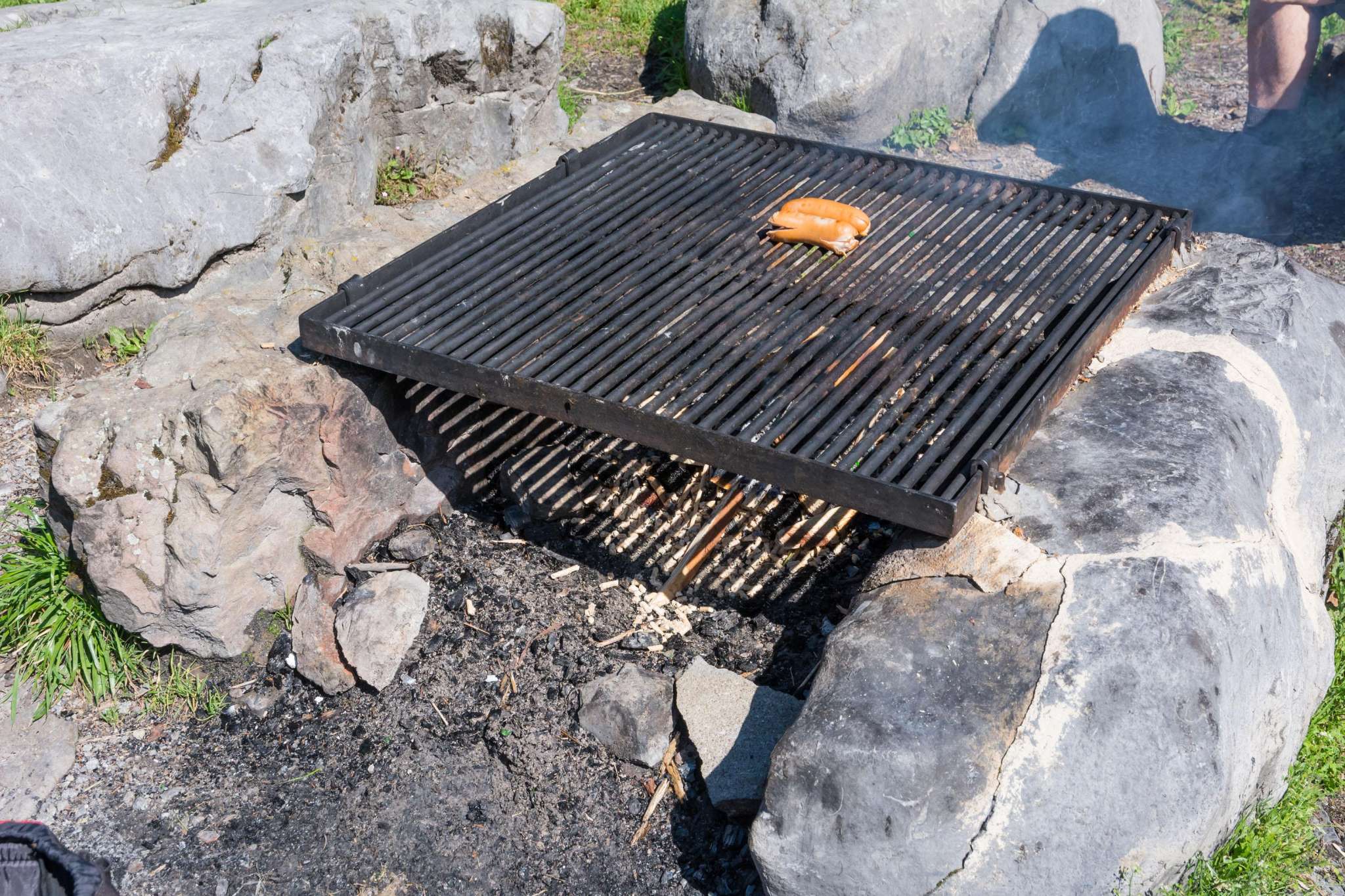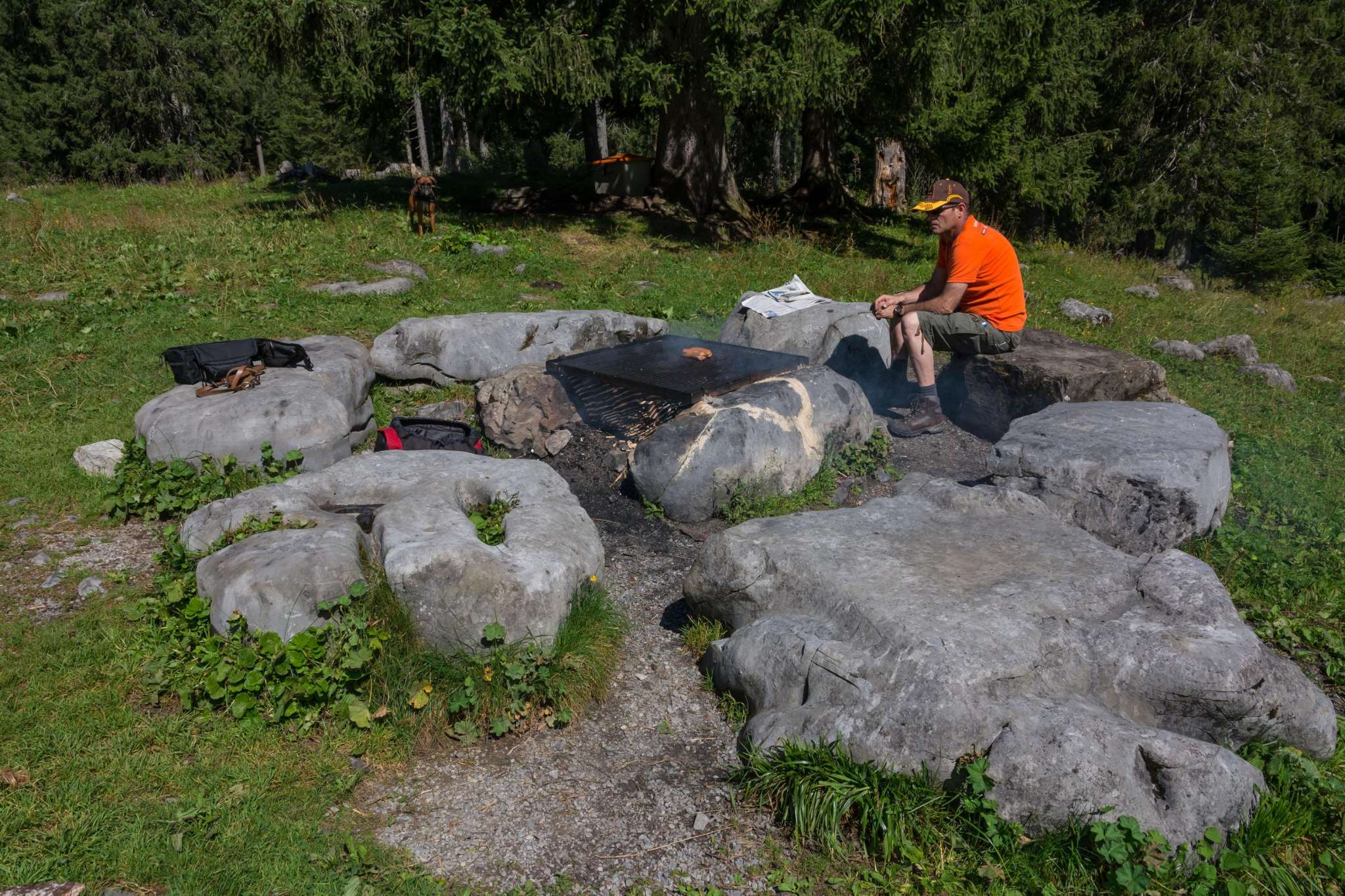 Der Grillplatz besteht aus einigen erodierten Kalksteinbrocken, die kreisförmig angeordnet wurden. Diese dienen als Sitzgelegenheit. Die Feuerstelle in der Mitte ist gemauert und verfügt über einen quadratischen Rost, den man in der Höhe nicht verstellen kann. In einer Kiste gibt steht ein kleiner Holzvorrat zur Verfügung. Ganz in der Nähe steht ein ToiToi-WC. Kinderwagentauglich: ja, Holz: ja, Trinkwasser: nein, WC: ja, Kapazität: ca. 10