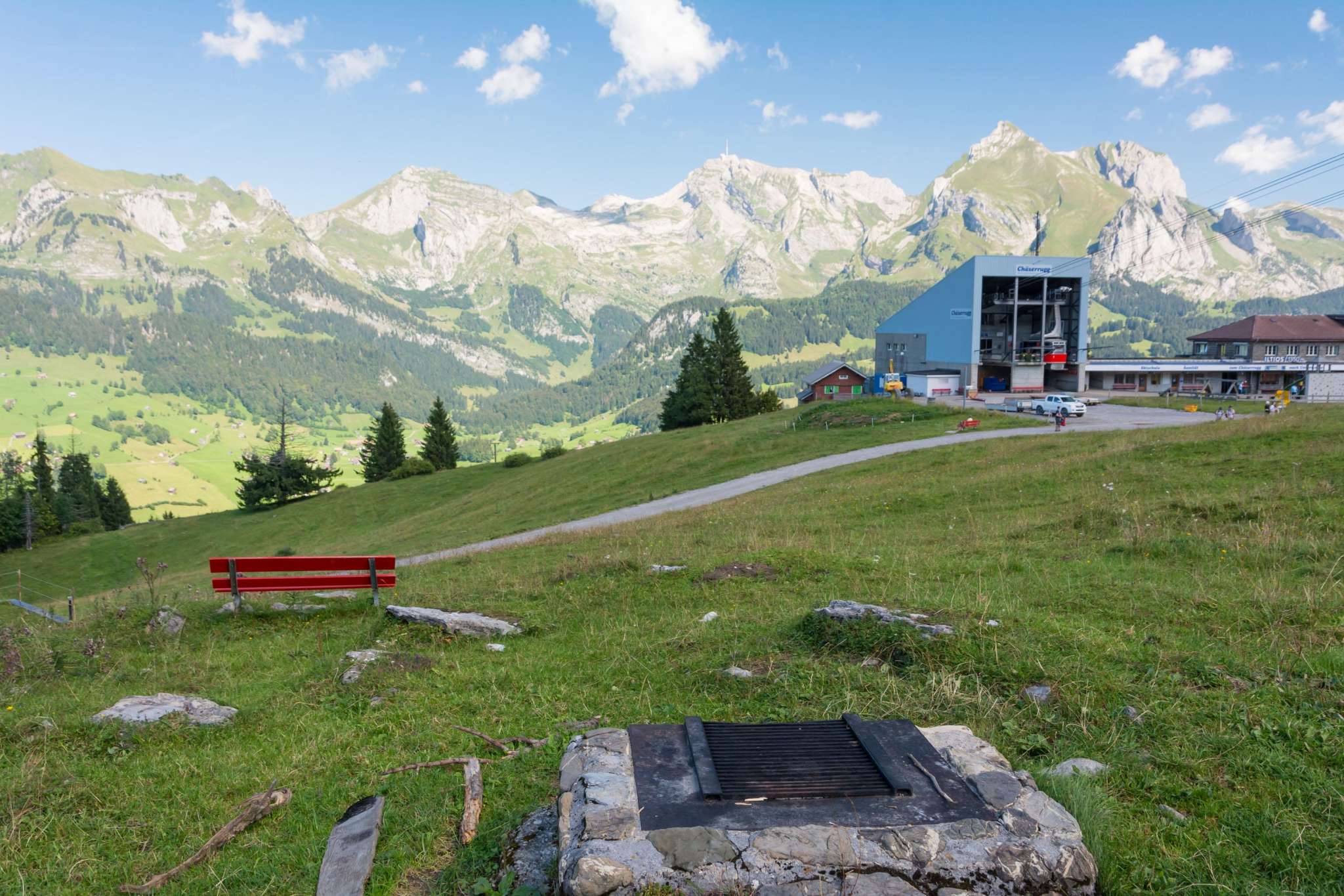 Einfacher Grillplatz nahe der Bergstation Iltios mit Kinderspielplatz und Restaurant.