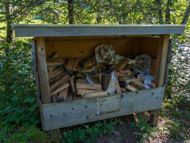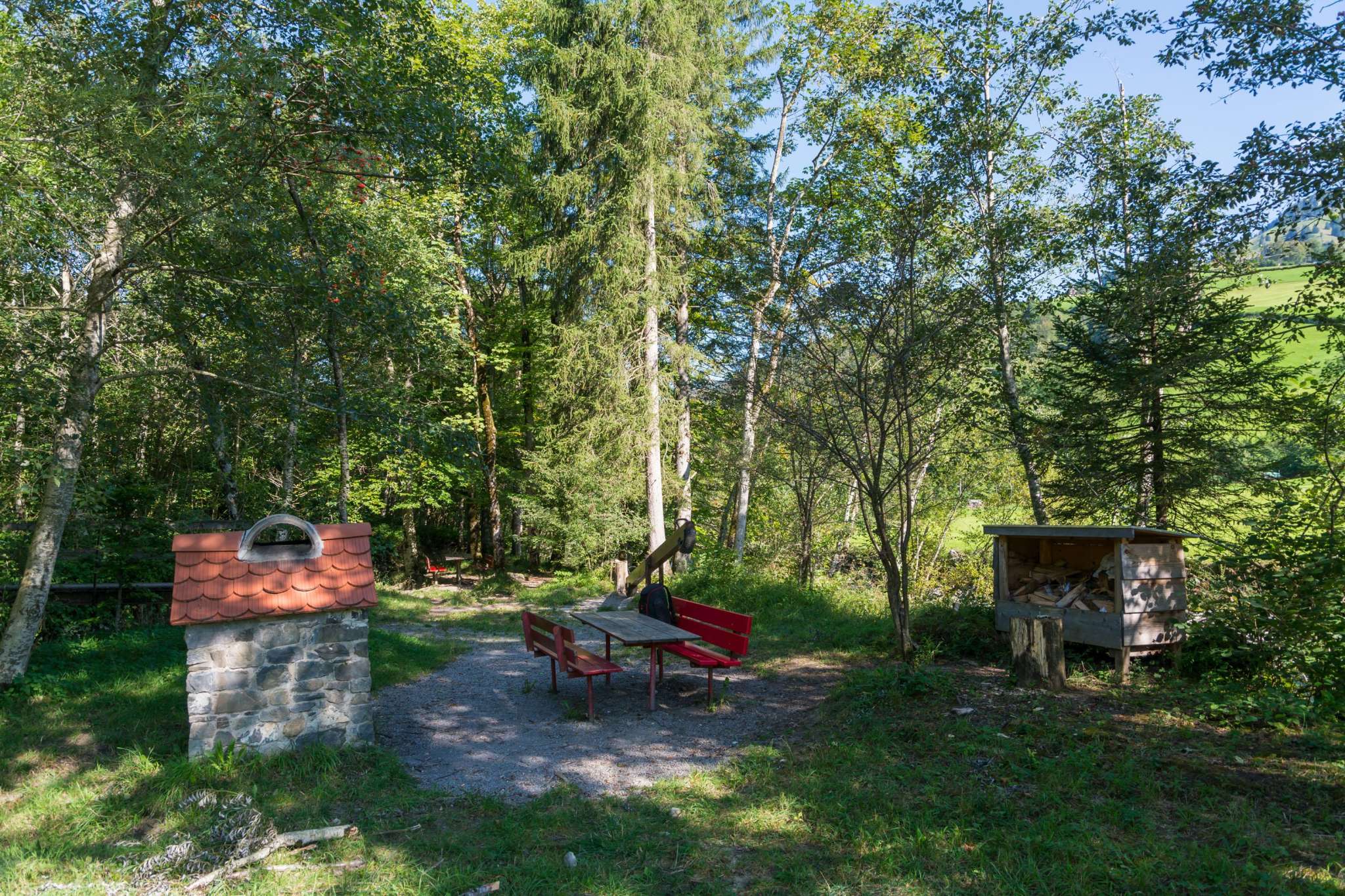 Einfacher Grillplatz auf einem Inseli in der Thur, mit Holz und Gigampfi.