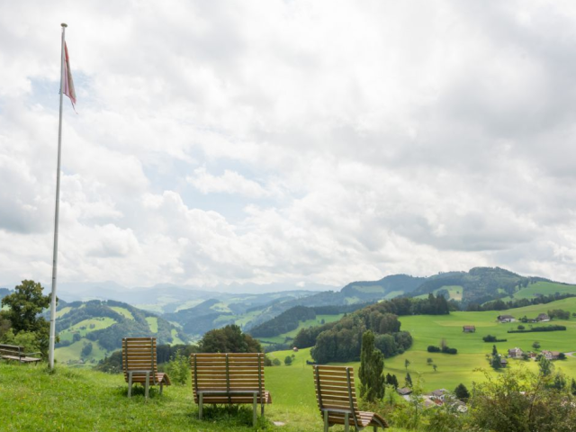 Das Kreuz Oberhelfenschwil ist ein herrlicher Ort. Die Aussicht rundherum ist fantastisch. Auf Holzliegestühlen, die an schönster Lage stehen, kann man das Panorama in aller Ruhe auf sich wirken lassen.