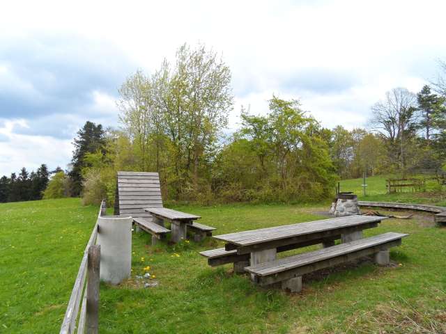 Vom Grillplatz aus reicht der Blick nach Norden. Man erblickt im Hintergrund die Stadt Wil. Der Grillplatz verfügt über eine doppelte Feuerstelle, sodass zwei Gruppen individuell grillen können. Der Rost lässt sich in der Höhe verstellen und zur Seite schwenken. Die Mitnahme eines Grillhandschuhs ist empfehlenswert, da der Rost bei brennenden Feuer sonst nicht verstelle werden kann. Um die Feuerstelle herum ist eine lange halbrunde Bank aufgestellt. Desweiteren gibt es zwei Tische mit Bänken. In einem kleinen Unterstand steht normalerweise ein Holzvorrat zur Verfügung. Bei meinem letzten Besuch war dieser aber leer. Auf dem Grillplatz gibt es sogar einen Wasserhahn. Auf der anderen Seite steht eine Infotafel, die über den Lebensraum Hecke informiert. Desweitern gibt es kleinere Tafeln, die über die Informationen über die verschiedenen Büsche liefert.