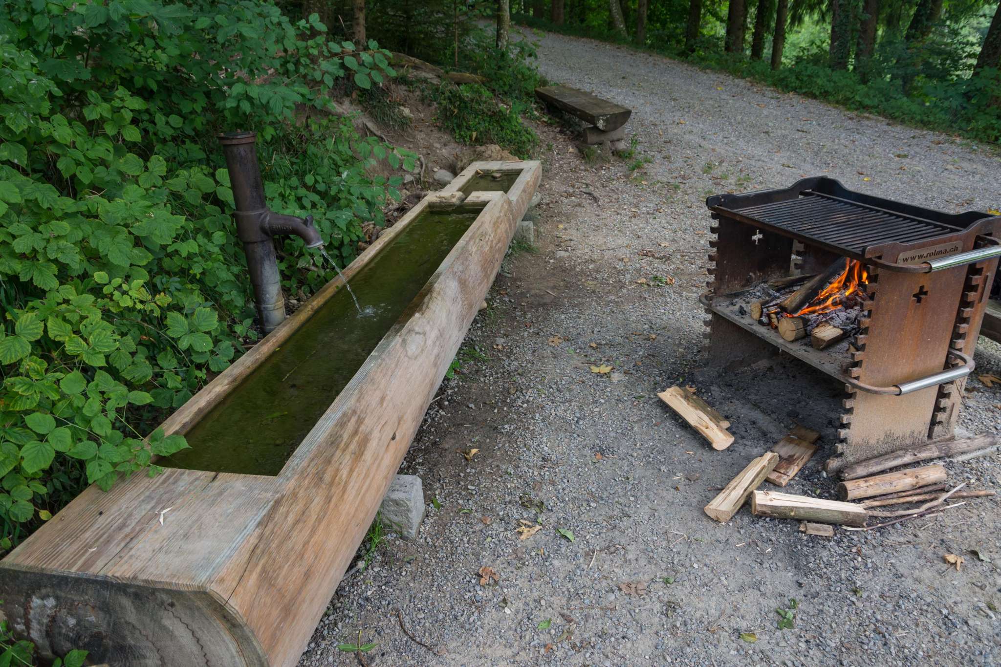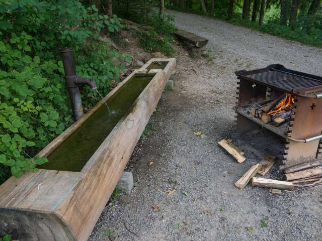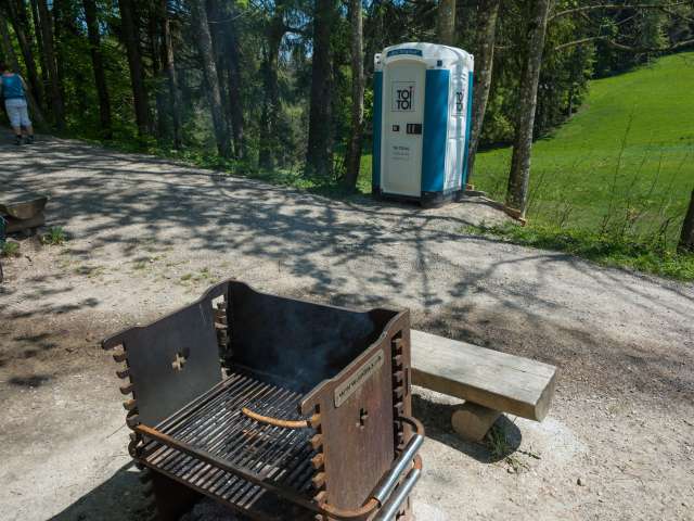 Der Grillplatz Windrädliweg liegt direkt am Waldrand. Er ist sehr gut eingerichtet und verfügt sogar über einen Unterstand, in dem sich ein grosser Tisch mit zwei Bänken befinden. Die Feuerstelle aus Metall verfügt über einen Rost, der leicht in der Höhe verstellt werden kann. Gleich daneben plätschert ein Brunnen. Auf der anderen Seite des Fahrweges steht ein WC-Häuschen zur Verfügung. Selbst ein Mülleimer ist vorhanden. An der Wand des Unterstands befindet sich ein Holzvorrat. Mehrere Bänke verteilen sich auf dem Grillplatz. Kinderwagentauglich: ja, Holz: ja, Trinkwasser: ja, WC: ja, auf der gleichen Wegseite ein Stück weiter im Wald, Kapazität: ca. 25