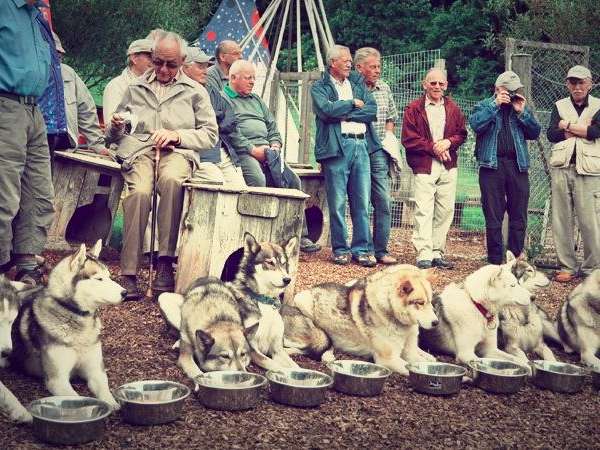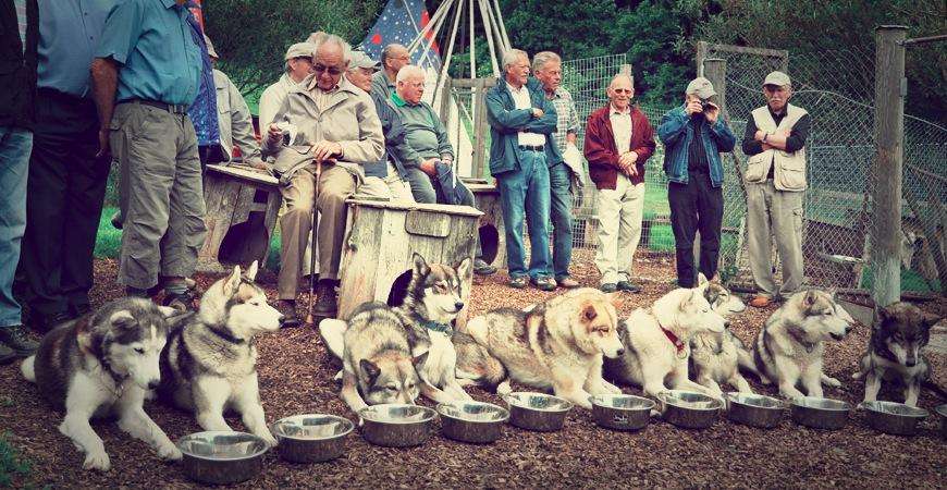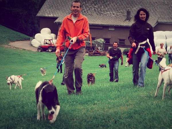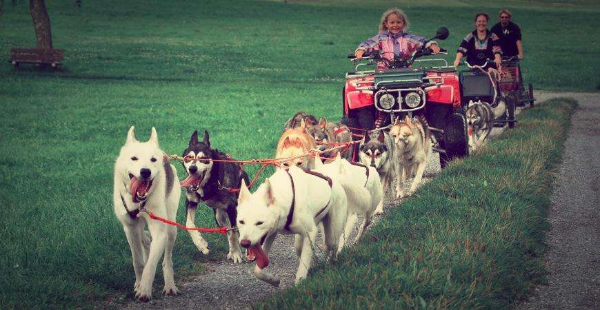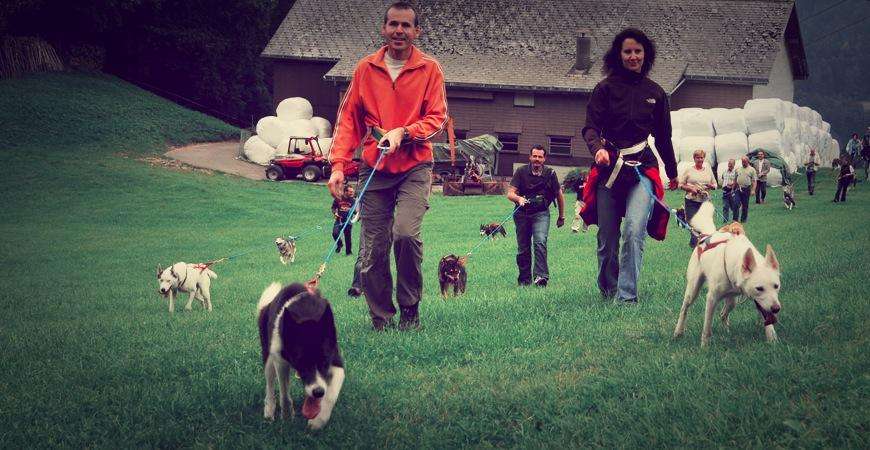 Im Winter mit den Schlitten, im Sommer auf Trainingswagen oder zu Fuss, egal wie, die Huskys lieben die Zugarbeit.
