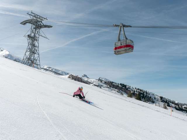 Rote Luftseilbahn vom Iltios auf den Gipfel, mit Kabinen entworfen von Herzog & de Meuron und Studio Noun