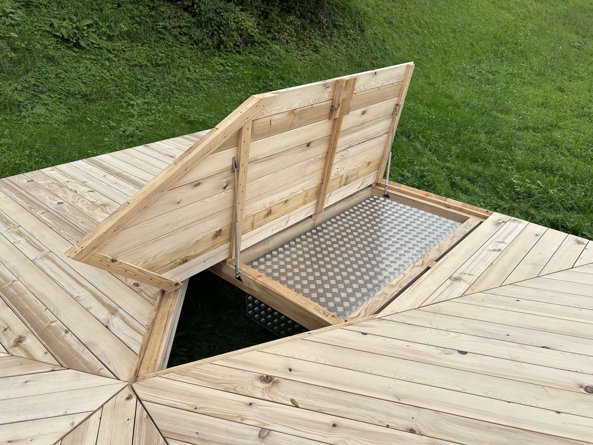 Aus heimischem Holz gefertigt, liegt diese Plattform entlang des Thur- und Neckerwegs frei im Landschaftsraum. Sie schafft eine klare, einfache Fläche im Freien – offen für das, was entstehen will.