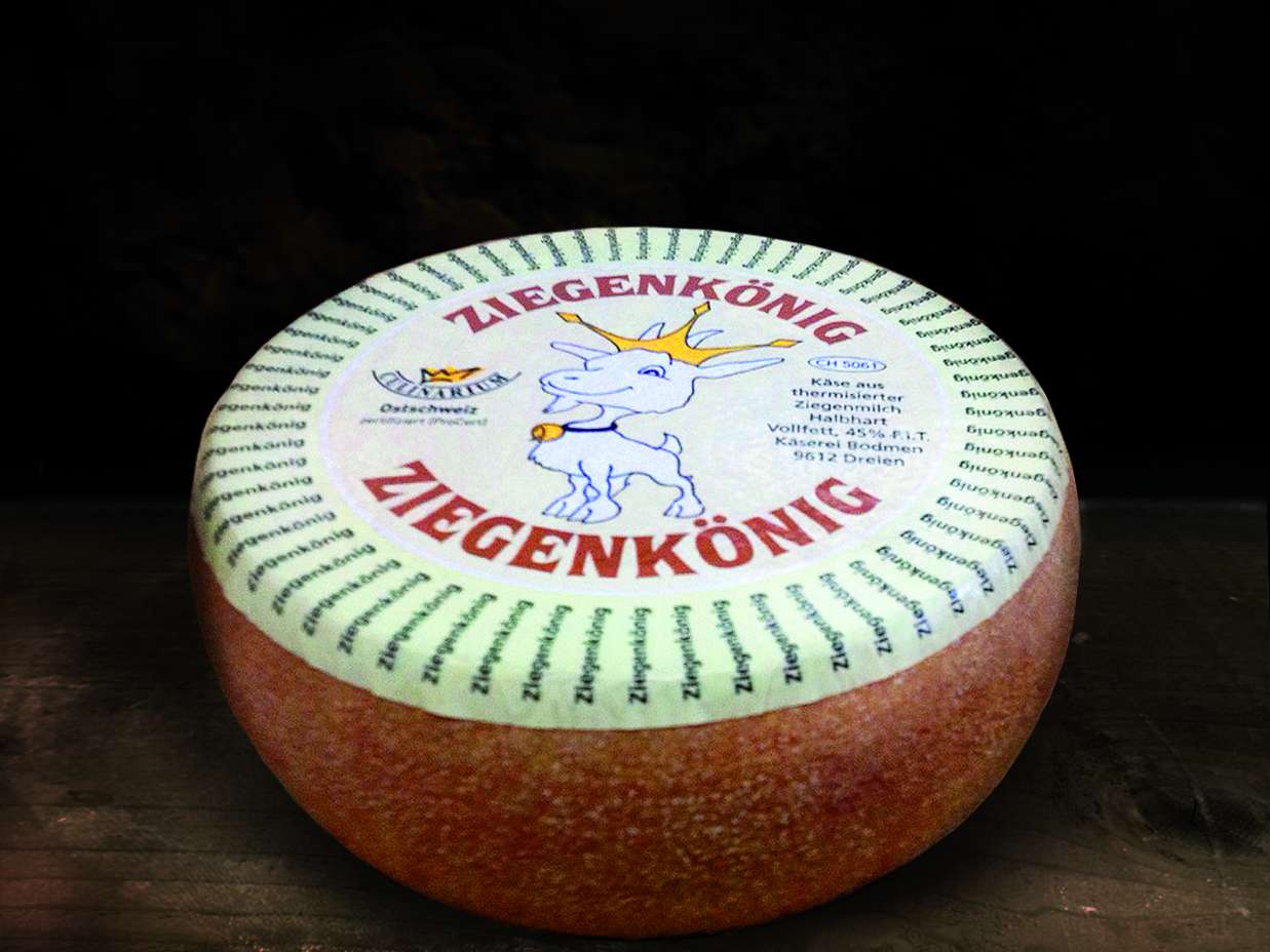 Auf den steilen Weidhängen im Toggenburg haben die Toggenburger Ziegen wahrhaftig die Krone auf. Die robusten und witzigen Akrobaten springen flink und doch grazil den würzigen Gräser nach. Die schlauen «Geissen» wissen ganz genau, wo sie die besten Kräuter und Sträucher wegzupfen können. Die fein herbe Sträucher-Mahlzeit an der frischen Bergluft verleiht der Milch dieses einzigartige Aroma. In der kleinen Spezialitäten-Käserei Bodmen, ein kleines König reich nur für Ziegenkäse, verkäsen die Güntensperger Käser die Milch in Handarbeit zum aromatischen Ziegenkönig. Dass der Ziegenkönig die Krone weit übers Toggenburg hinaus verdient, beweist auch die Auszeichnung am World Cheese Award 2017.